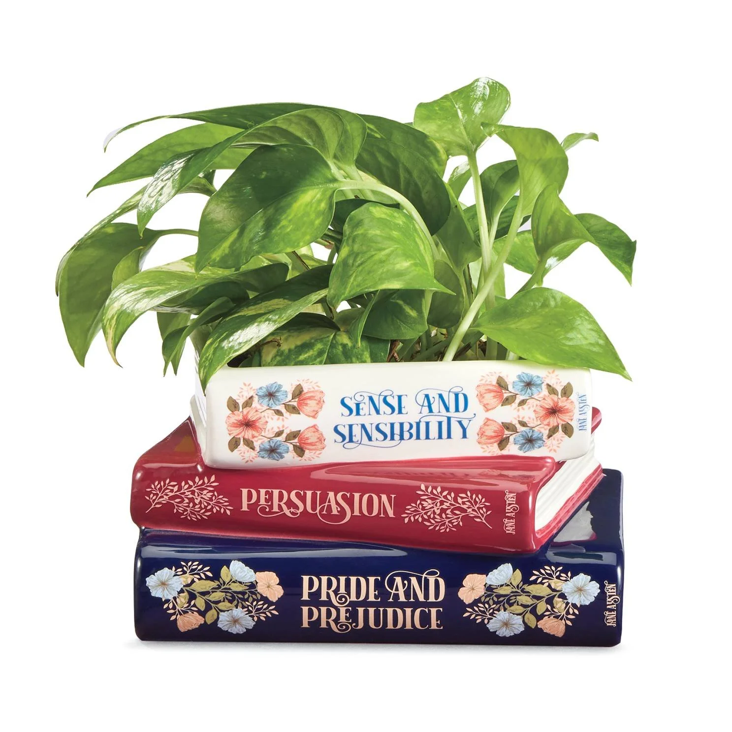 Sense and Sensibility, Persuasion, Pride and Prejudice—this ceramic stack of books is a lovely place for a small plant or succulent to flourish, just as Jane Austen’s masterpieces have flourished for generations. Has a drainage hole with rubber stopper
